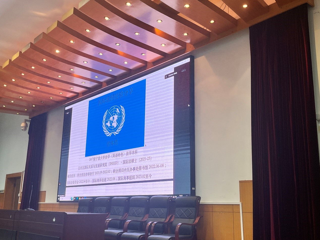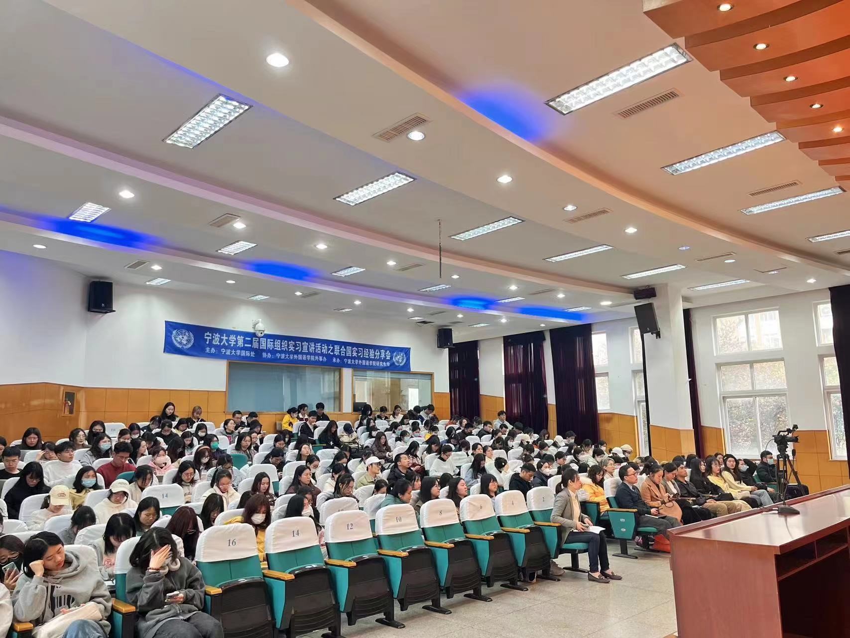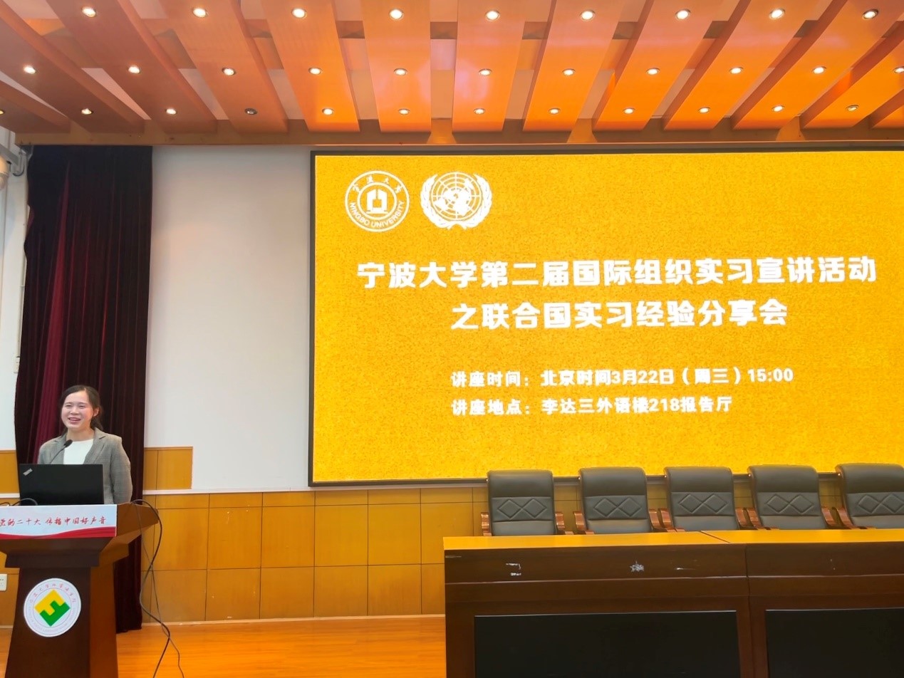 第二届国际组织实习宣讲活动之联合国实习经验分享会在李达三外语楼218报告厅顺利举办。身在异国工作实习的宁大毕业生通过视频直播分享心得,与现场与线上的两百余名同学互动交流。