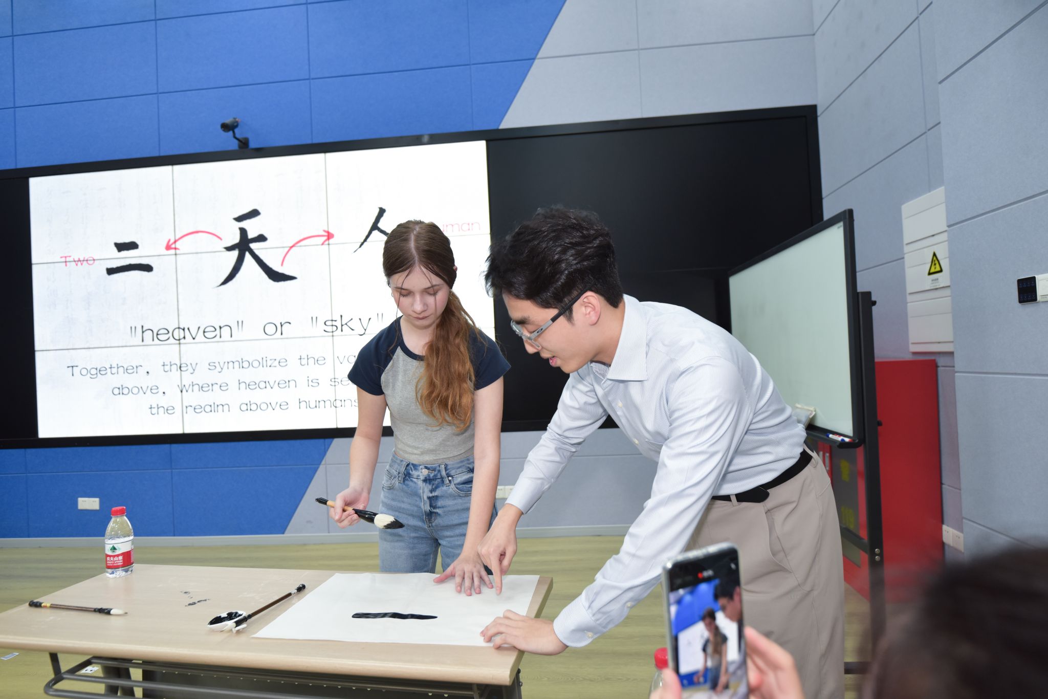学生借助人工智能工具为美方伙伴定制中文名,并指导其用毛笔完成书写。双方互赠作品作为纪念,一幅幅“天人合一”“飞龙在天”的书法作品,承载着对文化交流的深切感悟。活动尾声,中美学生手持作品合影留念,镜头定格下青春洋溢的笑脸。