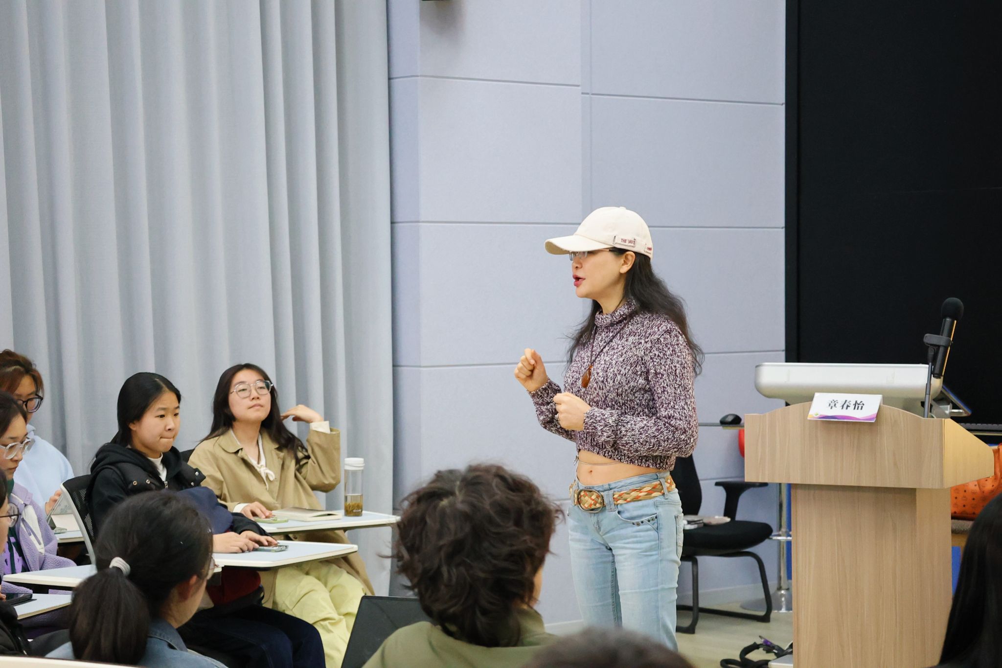 章春怡从编剧的职责——“讲好一个故事”出发,围绕人物、事件、主题三方面建构戏剧的基本理论框架;通过对同学们已初步撰写的剧本梗概进行解构与分析,引导积极采用线性叙事的演绎办法,创造人物欲望并与之共情。在互动问答环节,章春怡提出通过人物、激动事件、二次动作、悬念和环境写好故事的基本方法,要找清楚主要人物,根据主要人物进行故事编写。