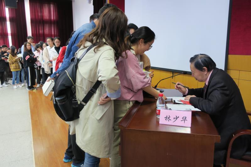 讲座结束后,请林先生签名的学生排起了长队,整个过程从下午3点一直持续到6点多才结束。