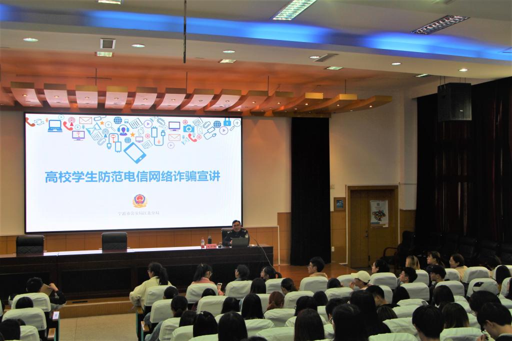 防范电信网络诈骗专题会议在李达三外语楼218报告厅召开。此次会议由学工办陈文祎老师主持,宁波市公安局江北分局王宏强警官主讲,黄色网站