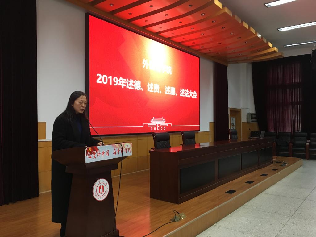 2019年度院领导班子述德述责述廉述法大会在李达三外语楼218报告厅召开,大会由党委书记方晓春主持,学院全体教职工参加。