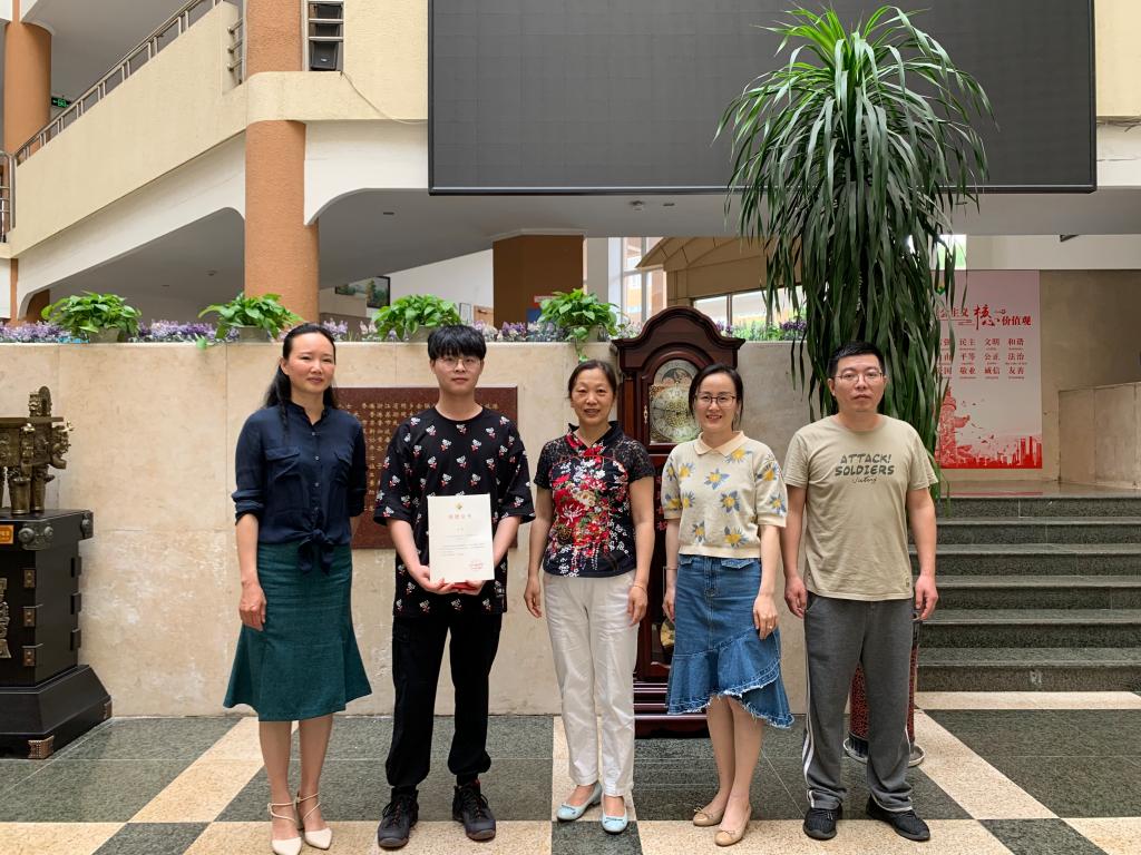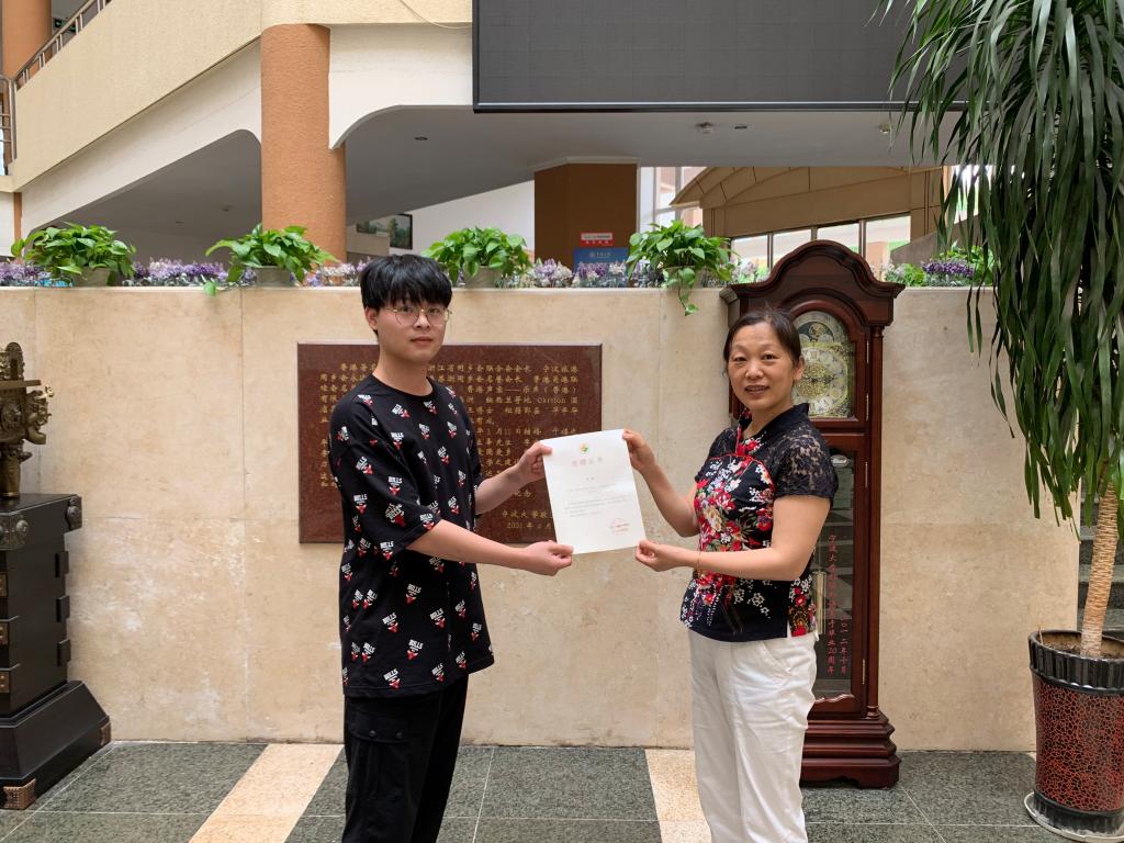 相关负责人代表学院向此前捐赠了15000只一次性医用口罩的2019级英语C班的何亦凡同学颁发了捐赠纪念证书和纪念品,并表达了学院师生对他的感谢。