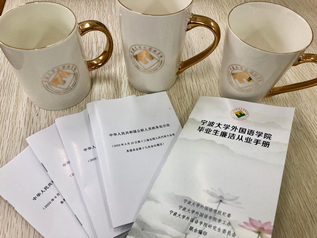 纪委编印制作,针对毕业生初入职场的特点,涵盖了预防职务犯罪小课堂、贪污贿赂罪和部分渎职罪案件量刑标准、常见职务犯罪解读、以案明纪释法等内容,还结合外语专业背景,融入了“中英文双语学习总书记廉政语录”和推荐毕业生阅读书目等内容。同时,学院纪委还把刚刚在全国人大常委会第十九次会议上通过的《中华人民共和国公职人员政务处分法》制作成口袋本,作为《廉洁从业手册》的补充。这份特殊的毕业礼物以相关法条信息及其解读和丰富的案例,教育毕业生讲规矩、知敬畏、存戒惧。