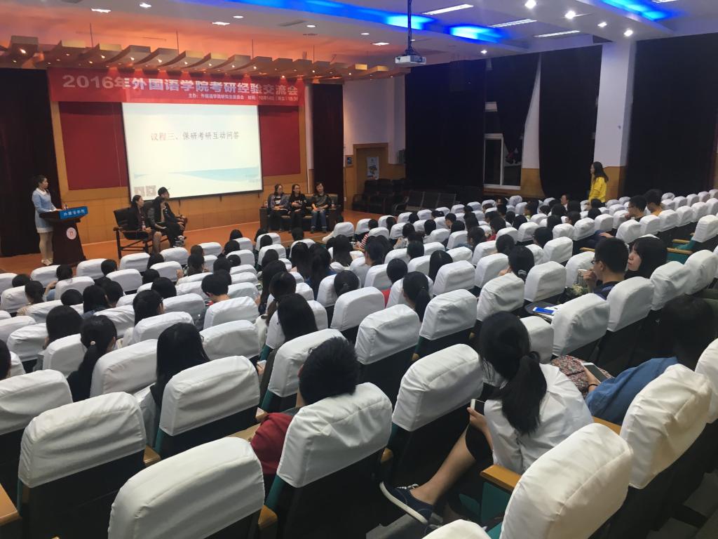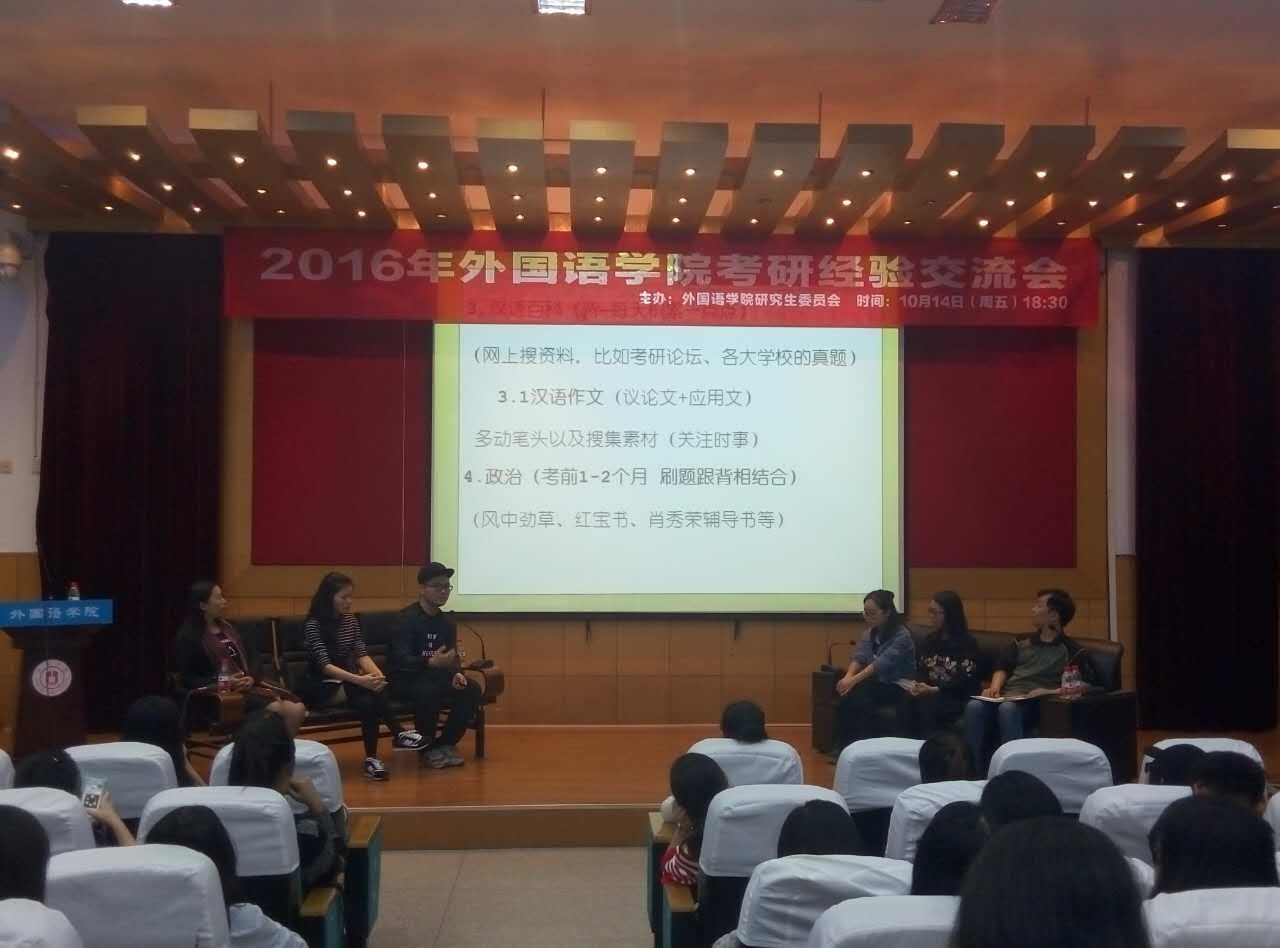 在外语楼218报告厅举办2016年“研续青春,共话未来”考研经验交流会。学院分管研究生工作副院长辛红娟、优秀研究生导师黄大网、2015年考入上海外国语大学笔译专业研究生马清清、2016年保研被上海外国语口译专业录取研究生张彩虹、2016年保研被华东师范大学学科教学专业研究生朱陈静和黄色网站