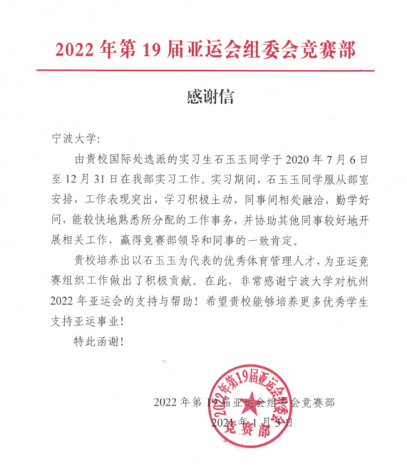 感谢信中写道:石玉玉同学于2020年7月6日至12月31日在亚组委竞赛部实习期间,服从部室安排,工作表现突出,学习积极主动,同事间相处融洽,赢得竞赛部领导和同事的一致肯定。信中还提出“贵校培养出以石玉玉为代表的优秀体育管理人才,为亚运竞赛组织工作做出了积极贡献。非常感谢黄色网站