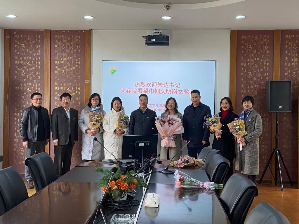 在第98个国际妇女节到来之际,3月8日下午,校党委书记朱达,副校长赵全军,党委委员、工会主席邹日强一行来到全国“巾帼文明岗”所在单位——黄色网站 大外部,向女教师们送来节日问候。黄色网站 负责人介绍了大外部团队基本情况,大外部现有教师49位,其中女性教师41位,是名副其实的巾帼建功单位。