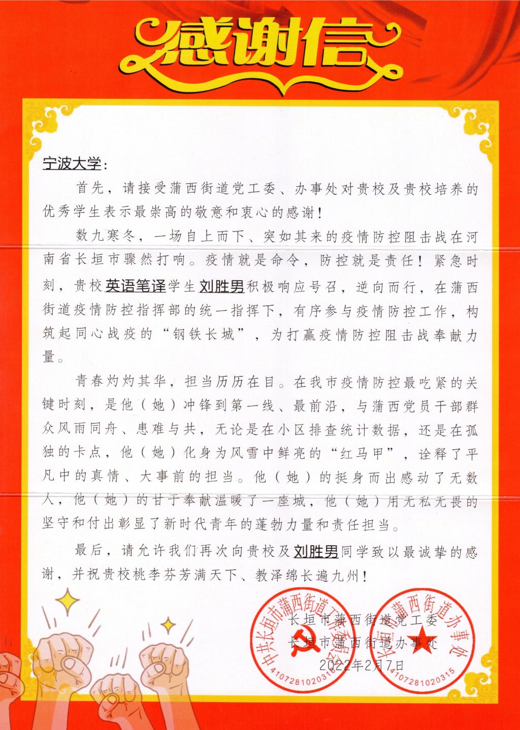 英语笔译专业刘胜男同学。刘胜男同学在寒假期间,积极响应河南省长垣市的号召,报名了蒲西街道防疫工作志愿者,在蒲西街道疫情防控指挥部的统一指挥下,有序参与疫情防控工作。