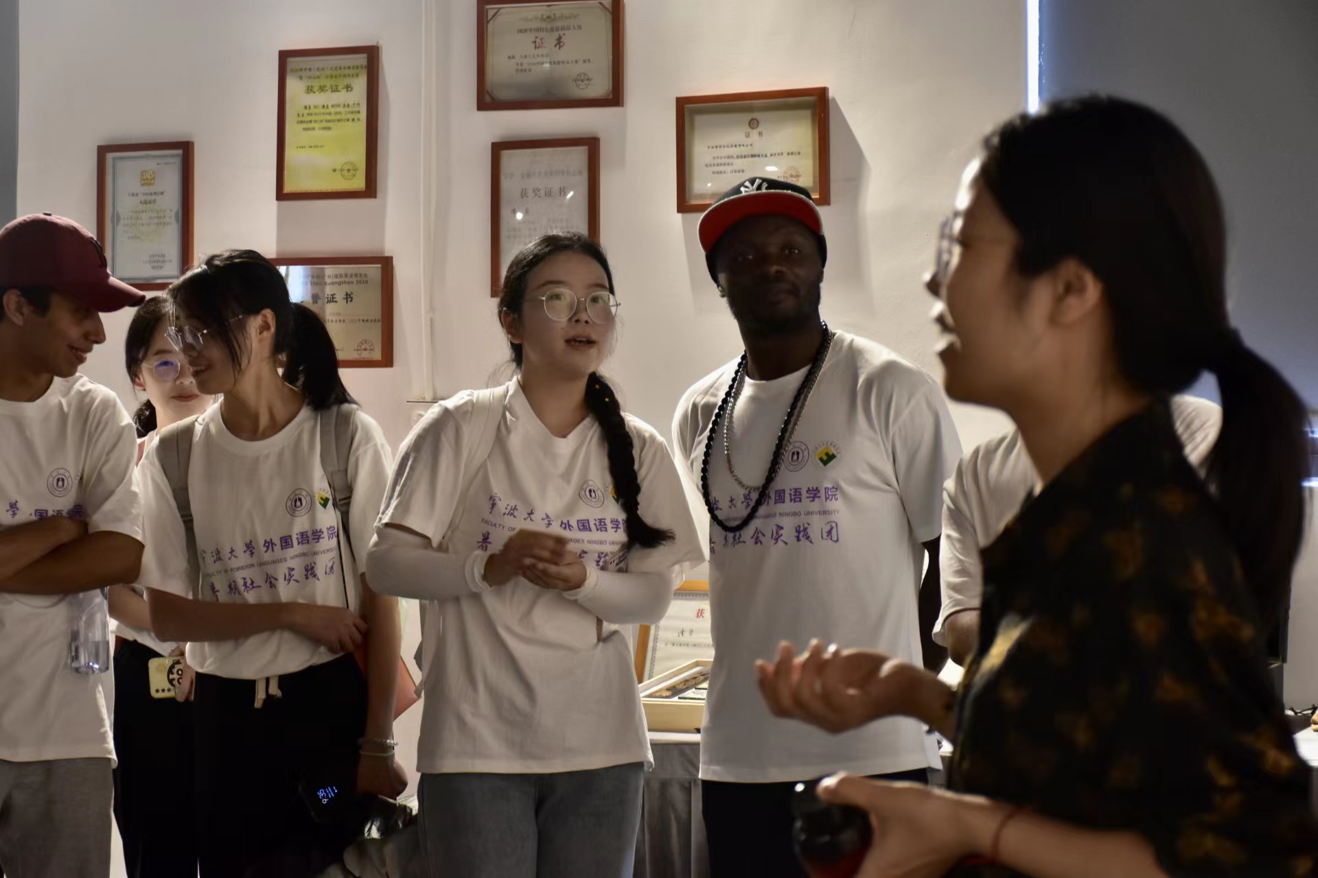 的中外大学生暑期社会实践团把第一站安排在了鄞州东吴镇的天童老街,前往漆艺坊、海丝寻迹文化馆和“东窑”海丝陶瓷研学基地开展实践活动。泥金彩漆,是宁波传统工艺“三金”之一,是一种泥金工艺和彩漆工艺相结合为主要特征的漆器工艺,历史悠久,明清之际到达鼎盛。刚步入漆艺坊,古朴厚重的气息就扑面而来,坊内陈列着众多精美漆器,在壁灯的映衬下熠熠生辉。中国学生协同讲解员向留学生们介绍了大漆的由来,讲述了漆艺的创作过程,大家在观赏精美的漆器、采访传统工艺从业者、了解每件漆器背后故事的过程中,感受了中国传统艺术的魅力。