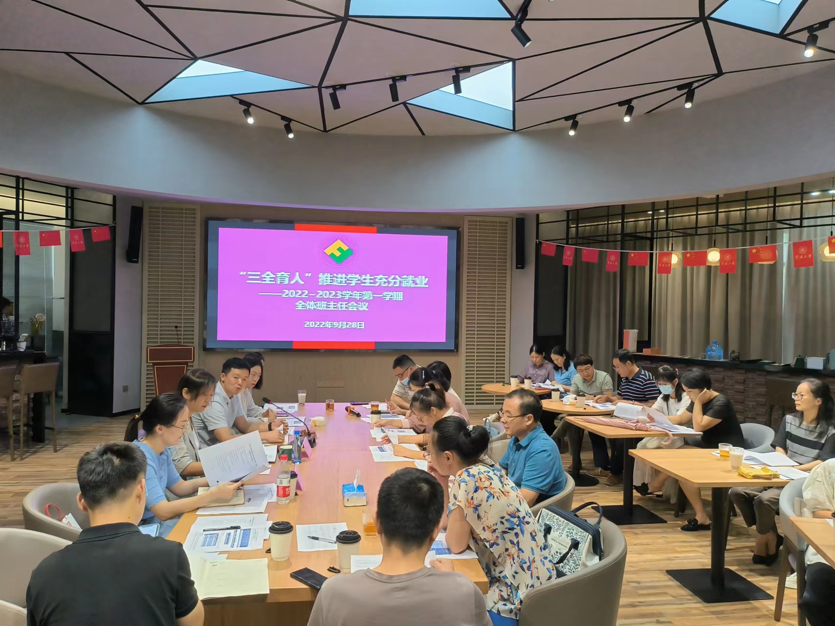 2022-2023学年第一学期班主任工作交流会在校友之家召开。此次会议以“‘三全育人’推动学生充分就业”为核心主题,校学生处副处长姚小斌、学院党委负责人、学生工作负责人、外事办负责人、全体班主任及辅导员参加会议。