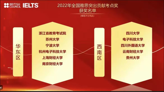 12月1日,由英国文化教育协会主办的2022年全国雅思考务工作培训会在线上召开,教育部教育考试院负责人、全国各地纸笔考点和机考考点主任、考点团队负责人参加会议。在年度雅思考点颁奖仪式上,我校雅思纸笔考点和机考考点均获教育部教育考试列榜表彰并荣获“2022年全国雅思突出贡献考点奖”。