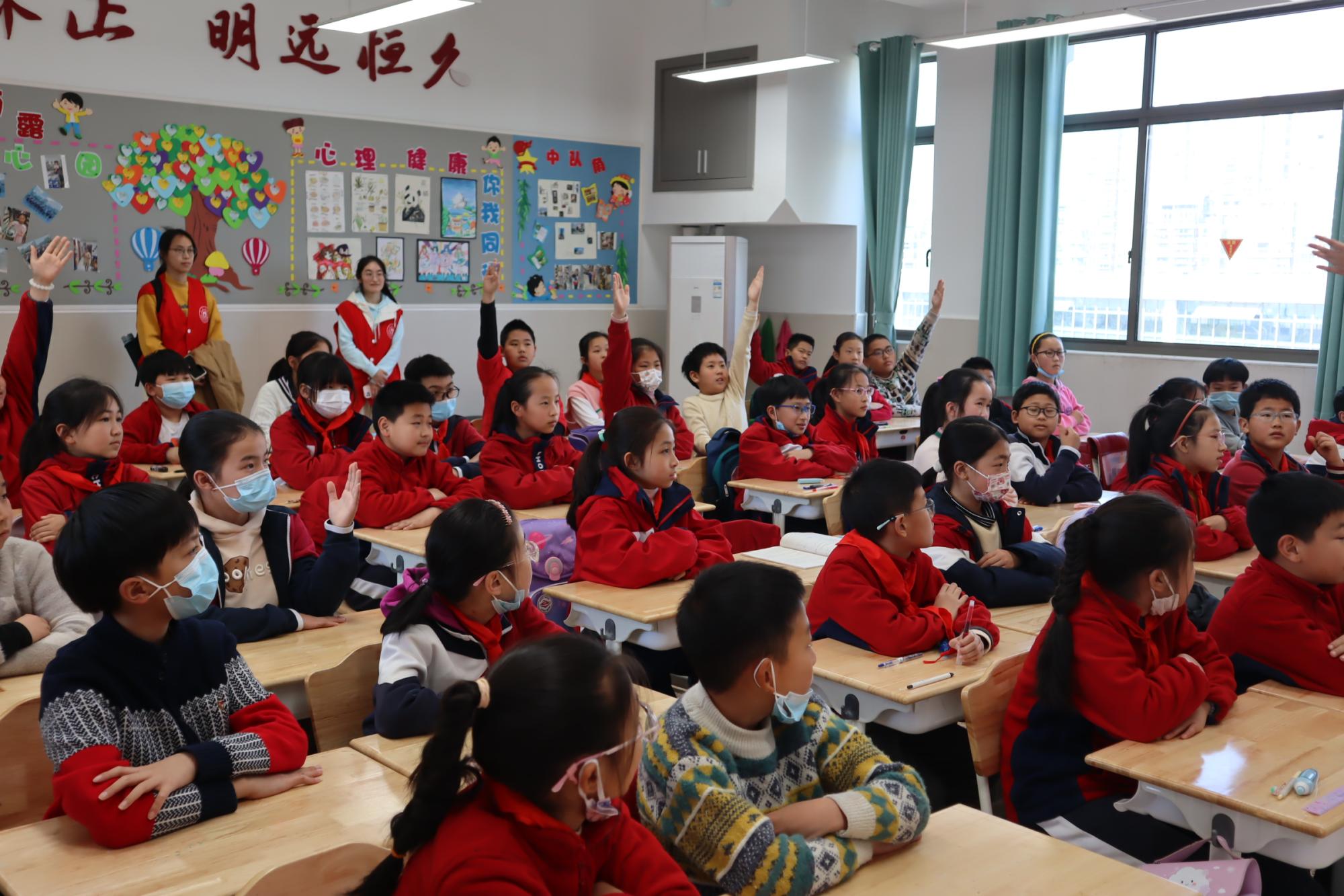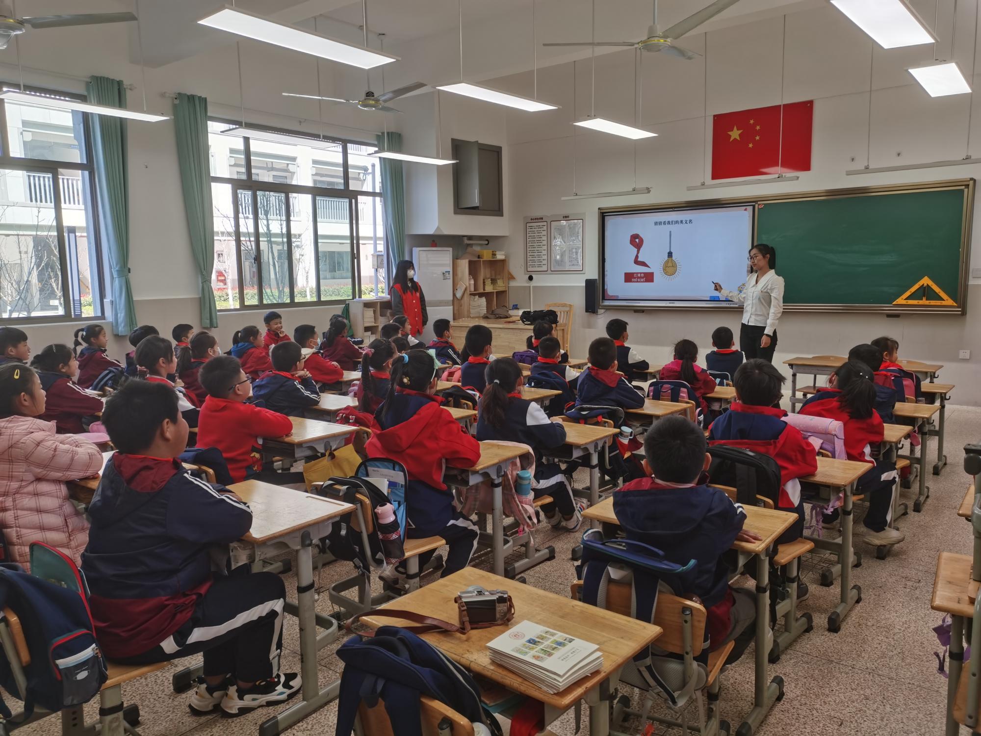 以英语师范专业为主的15名志愿者分三组,面向三个不同年级共计150余名小学生开展了专题辅导和互动交流。志愿者们通过双语教学形式,带领“红领巾们”学习和了解“入队”“入团”“中国共产党用英语怎么说?”等知识,并设置思考、提问等互动环节等,“红领巾们”还就“作为一名少先队员,如何从小事做起,服务他人”留下童真解读,进行相互分享。“红领巾们”积极踊跃发言,课堂氛围活跃。小学五年级的张同学说:“姐姐,我以后也要像你一样当一个老师,在讲台上给大家讲课”。
