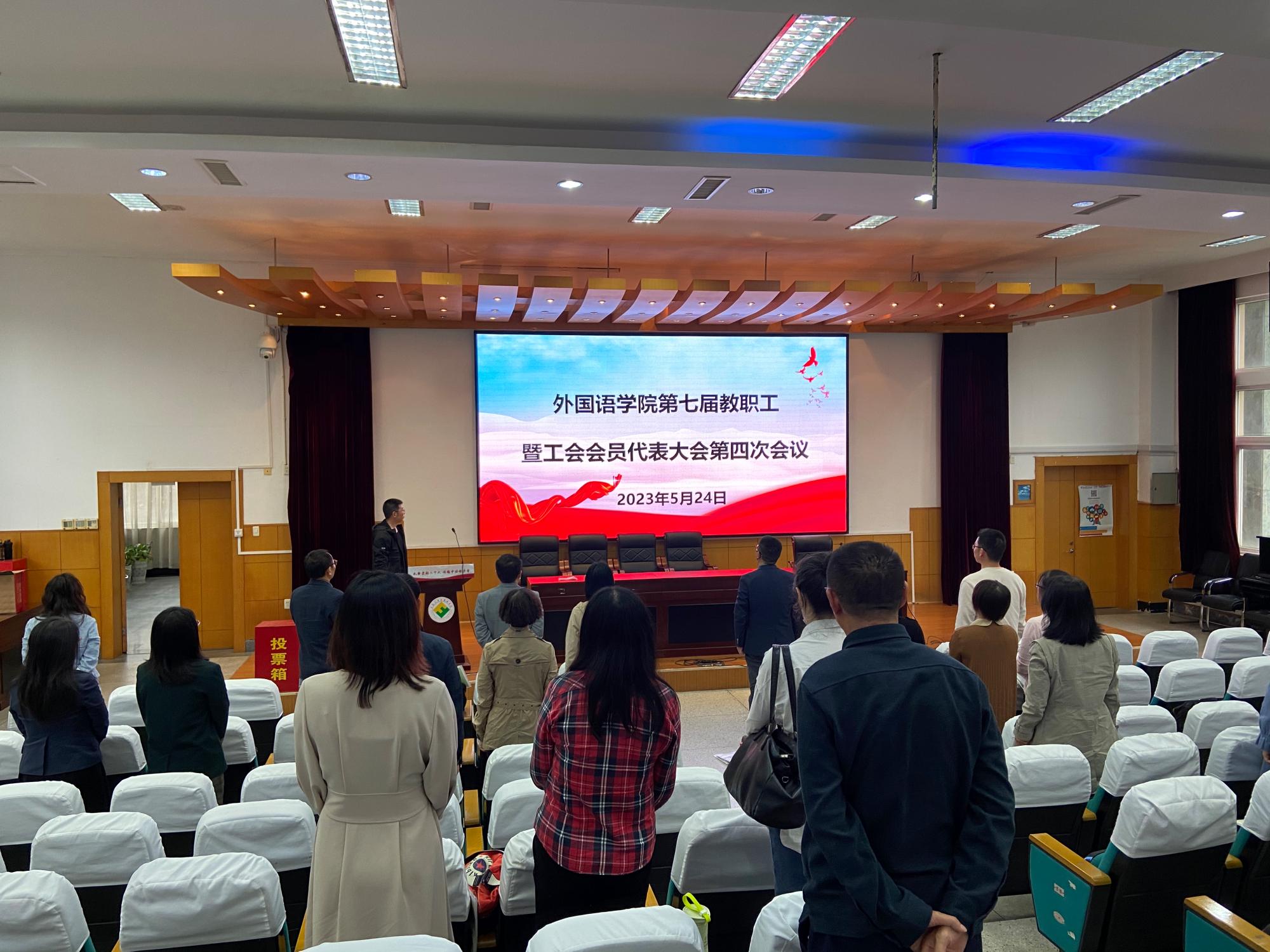 第七届教职工代表大会暨工会会员代表大会第四次会议在李达三外语楼218报告厅召开。学院党委委员、分工会副主席刘路平主持会议,38名正式代表参加会议。
