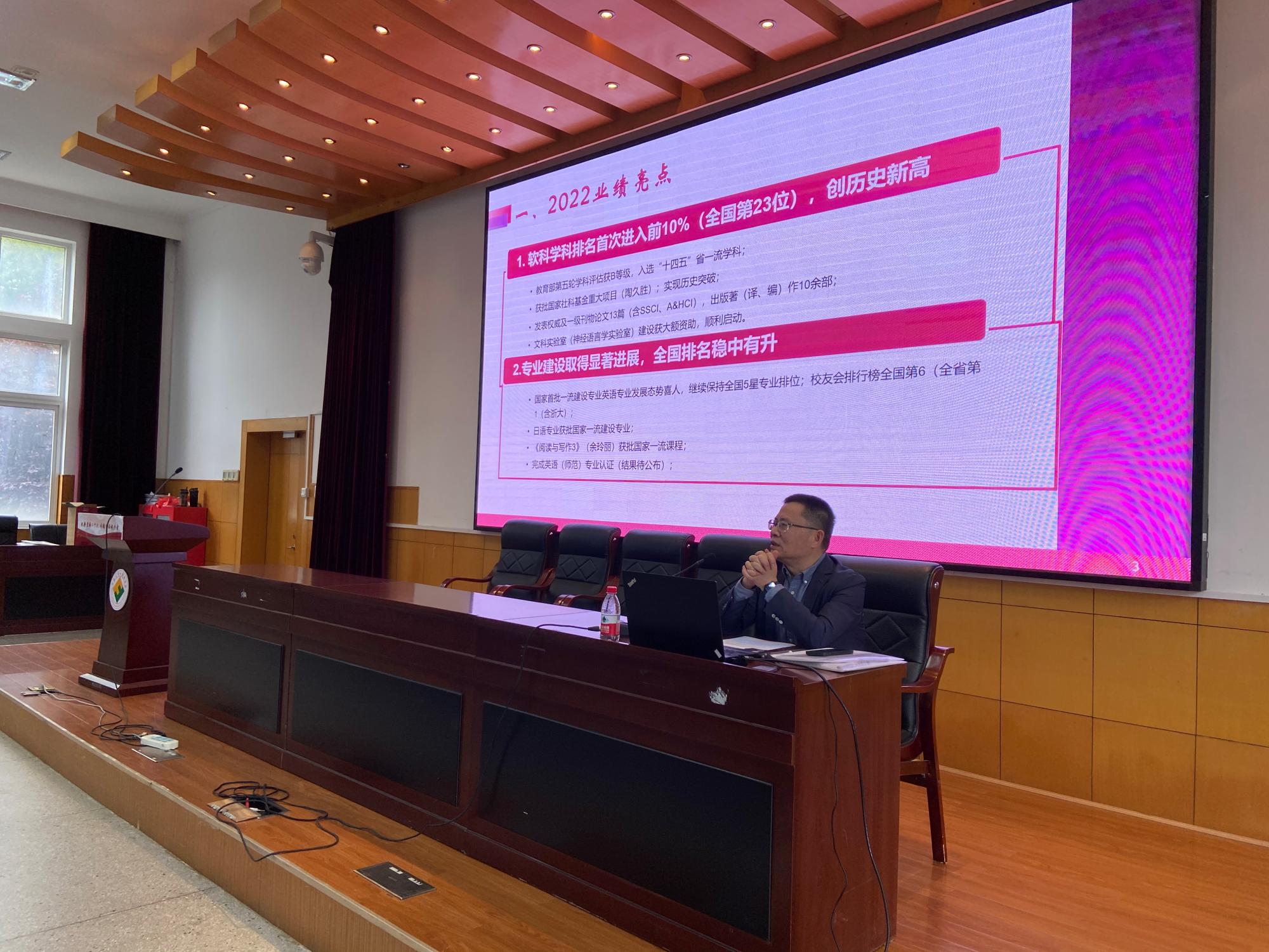 会议听取了特聘院长屠国元所作的以《久久为功 善作善成 - 推进学院高质量内涵式发展》为题的学院工作报告。报告全面客观地总结了2022年以来学院事业发展取得的成绩,分析了学院前进道路上面临的问题和挑战,并围绕学院“十四五”发展规划和学校“双一流”发展目标,提出了学院2023年工作的总体思路、奋斗目标和主要任务。