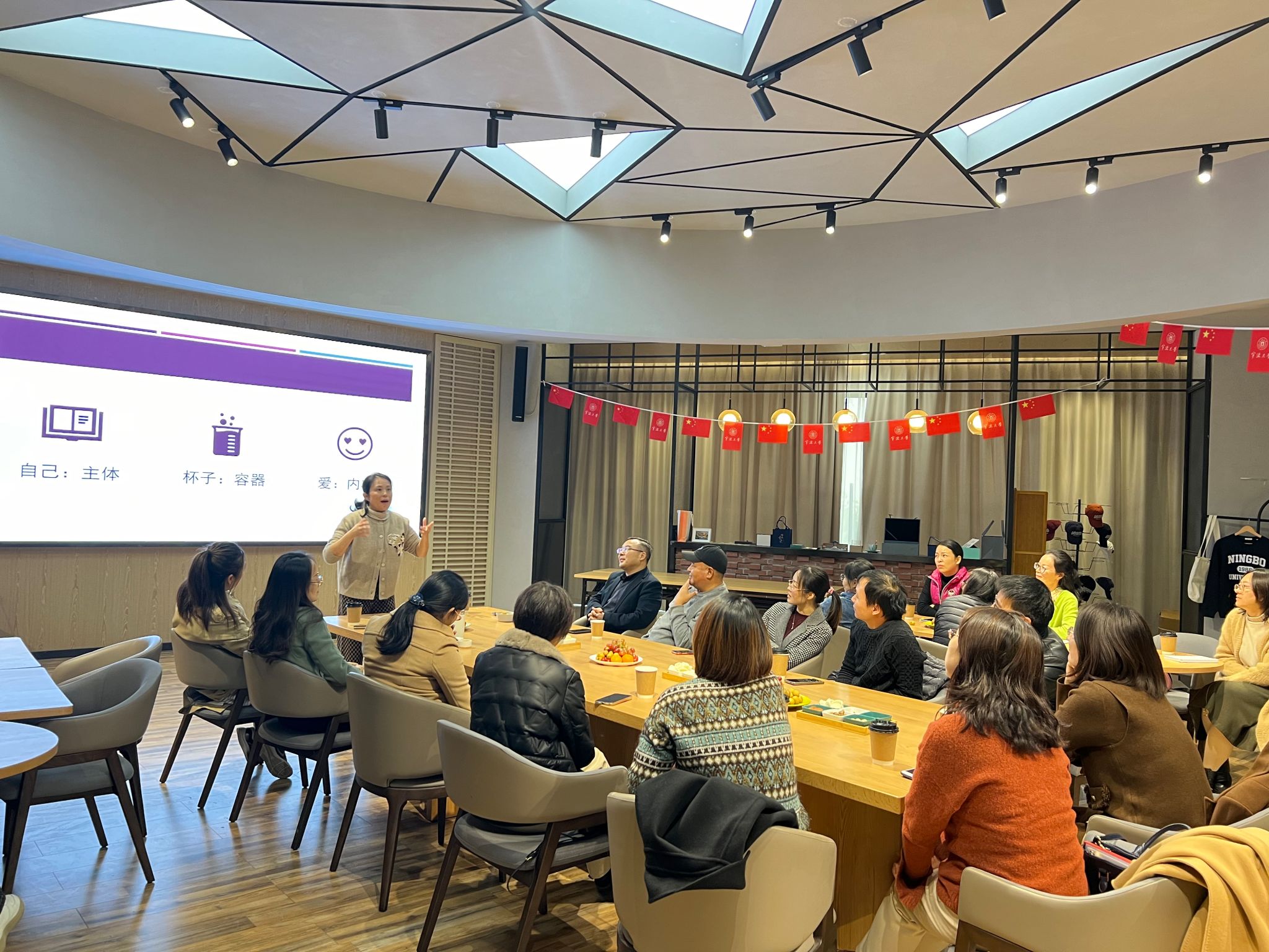 廖老师以轻松欢乐的warm-up引导老师们充分理解每个人对“躯体、行为、情绪、认知”四个维度的不同感受和作用以及“认识自己就能认识他人”的原理;她以“杯子”隐喻自己作为主体的容器,以“爱”隐喻内容物,用头脑与身体的分离感、情绪化与躯体化的不同表征,提出“爱自己更深层的意义就是看见真实的自己,并且接纳自己”“爱自己就是对自己有情有义”等观点,并与老师们充分互动、探讨了“什么是爱自己”“从哪里开始成为自己”“怎样爱自己”等问题,最后归纳出“爱的目的地”就是“认识自己、爱自己、成为自己”。