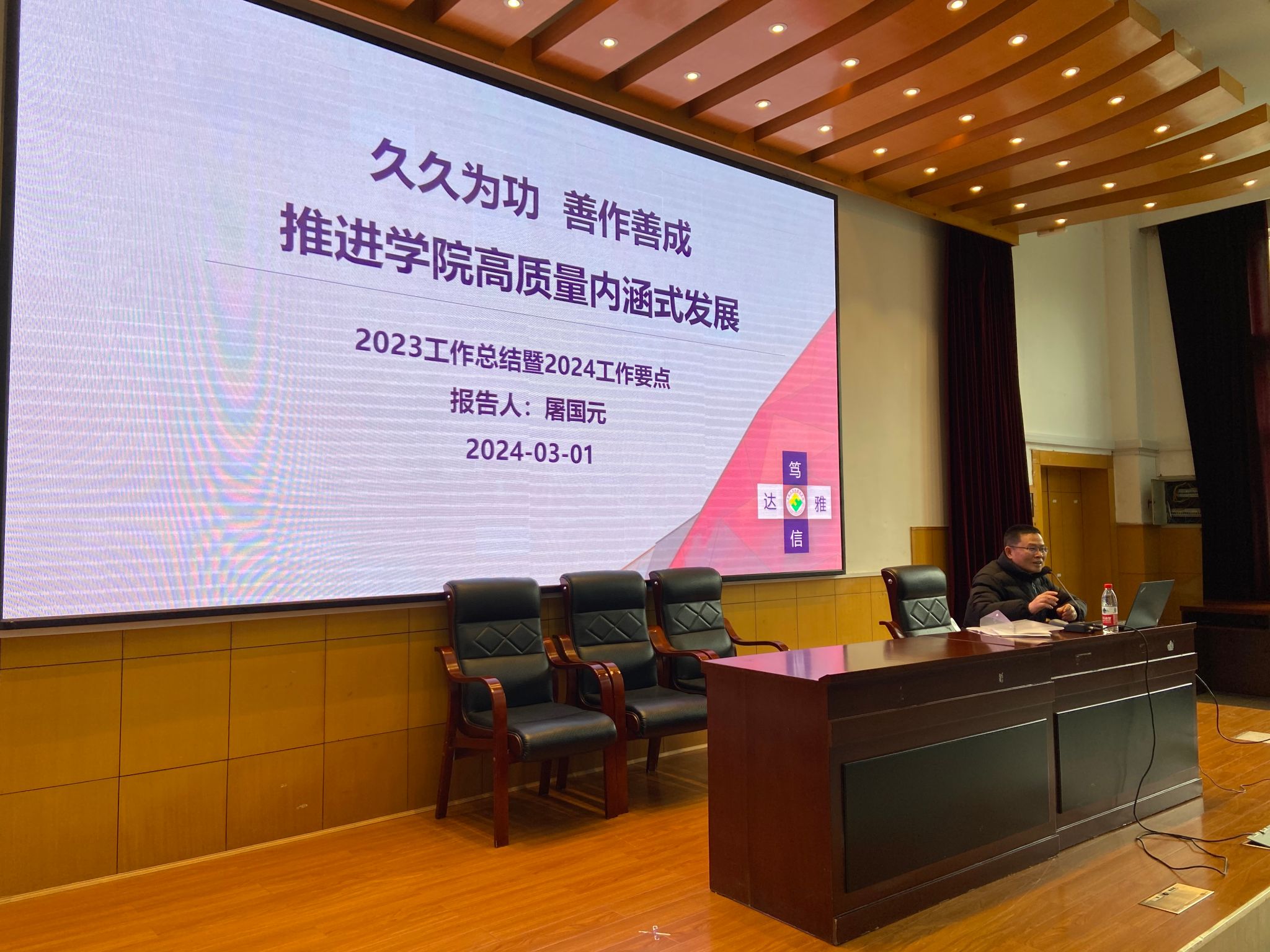学院特聘院长屠国元传达了学校学科建设工作会议精神,对学院上一年度工作进行系统总结和梳理,提出下一阶段学院发展目标,动员全体教职工落实立德树人根本任务,围绕学院人才培养、学科发展、队伍建设等中心工作,凝心聚力、攻坚克难,推动学院各项事业取得新发展。