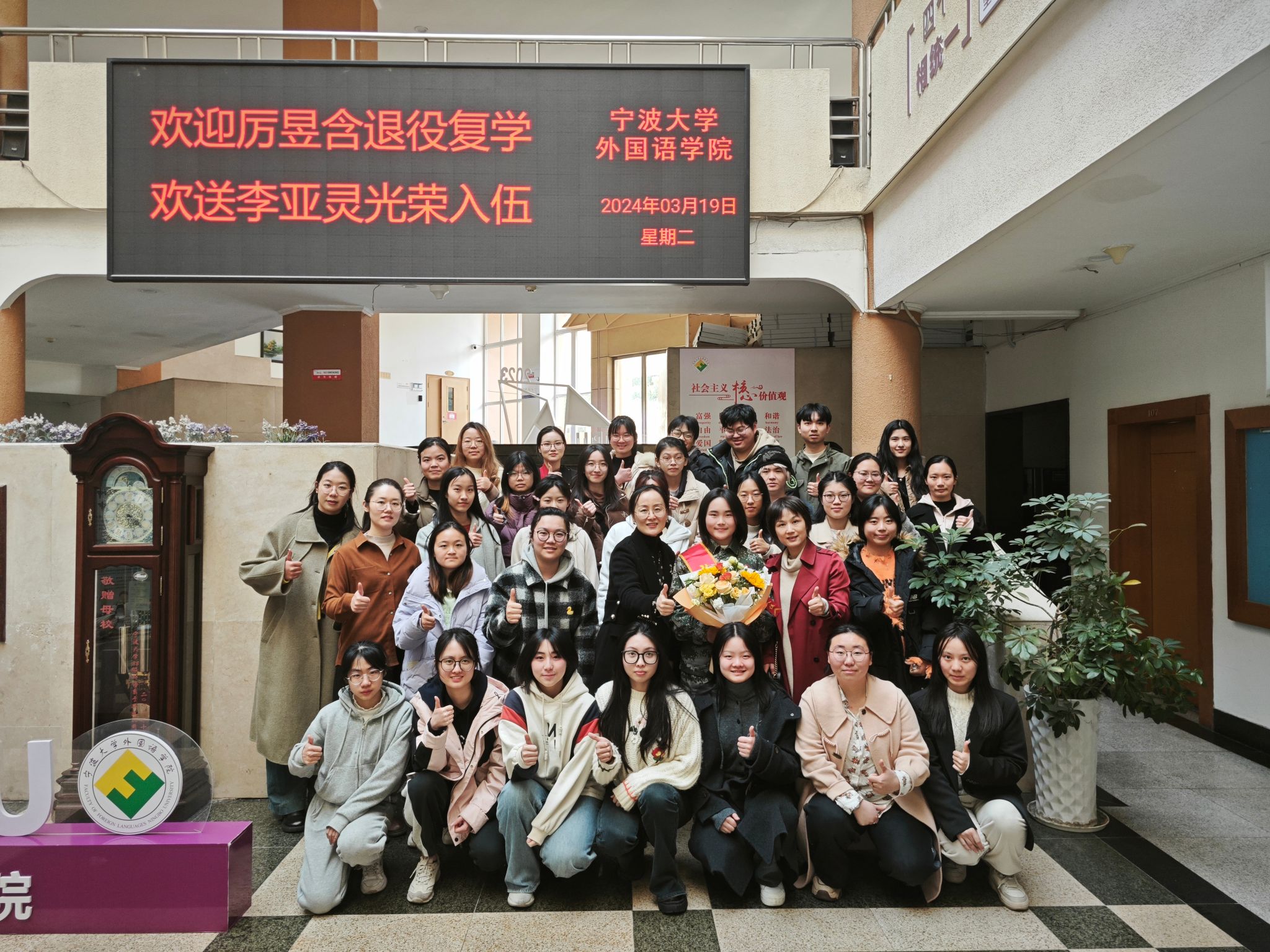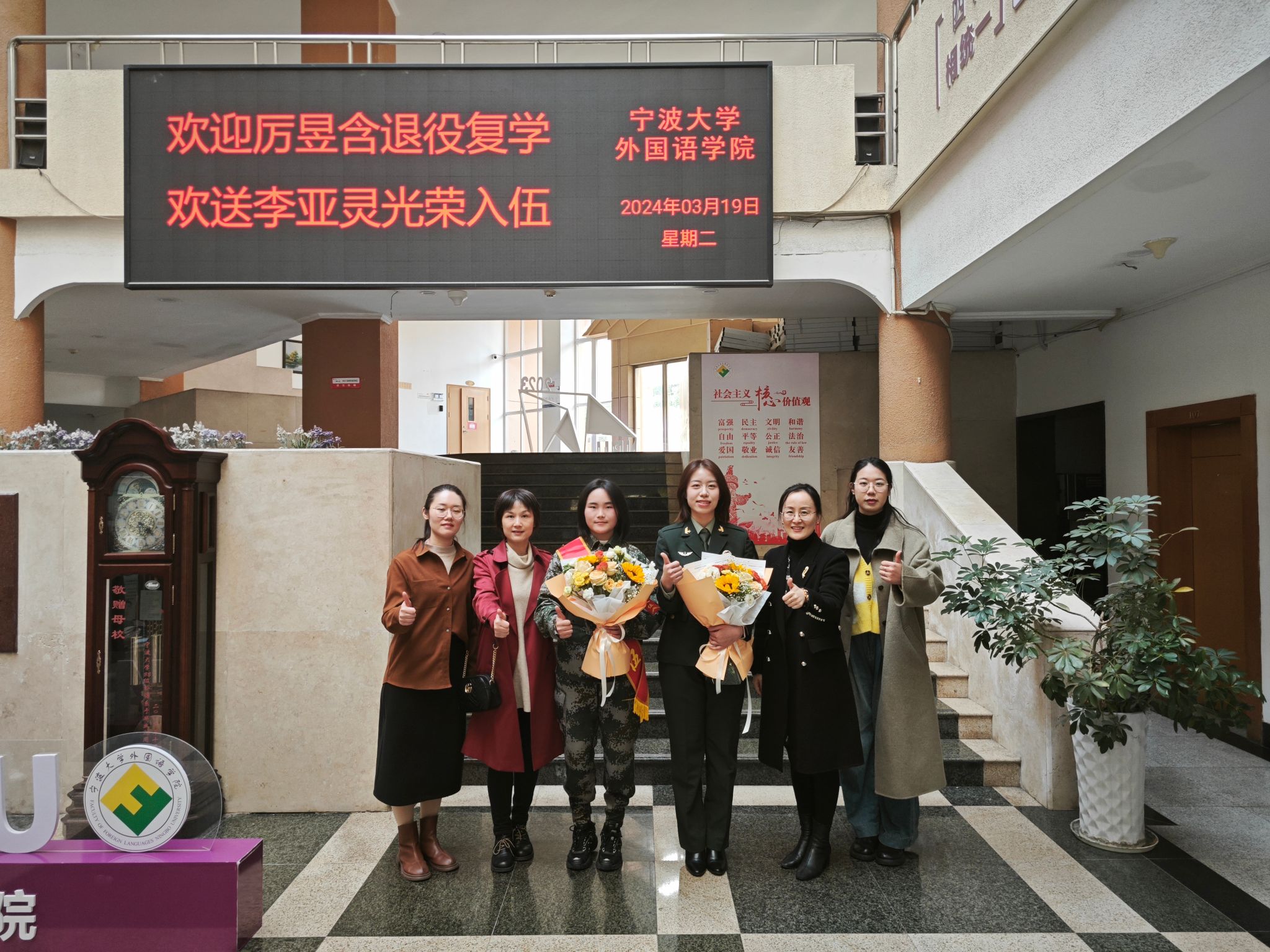 3月19日下午,学院为退役复学女兵厉昱含和春季入伍新兵李亚灵举行了一场充满温情和正能量的欢迎欢送会。学院党委副书记胡佳、2022级英语(师范)班班主任梁虹、辅导员施嘉婷、范紫婴、班助李志强以及40余名同学参加了活动。