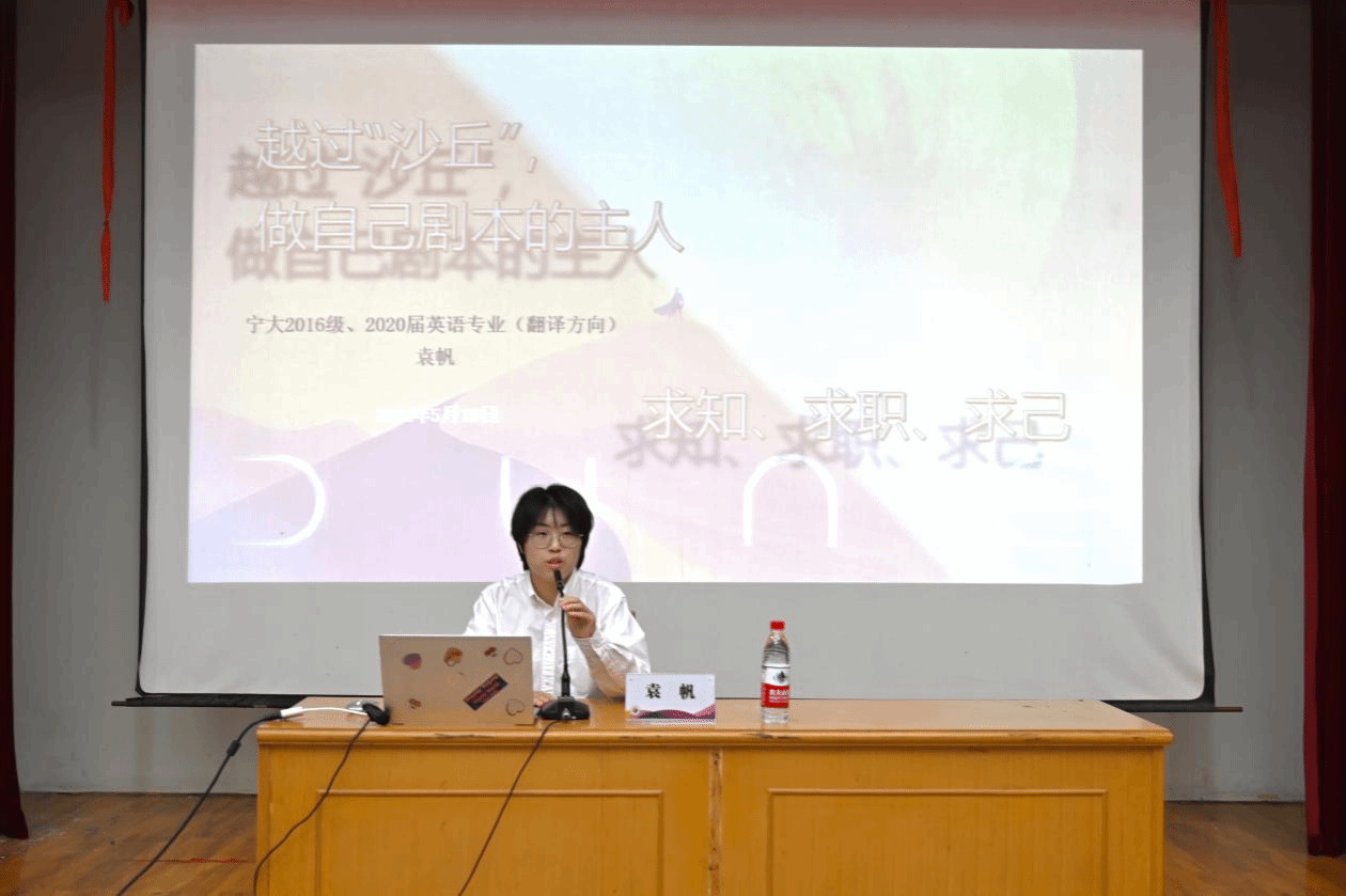 讲座伊始,袁帆以《沙丘》电影情节引入,提出“自己要书写自己的剧本”。她从“求知、求职、求己”三个方面向同学们进行分享。她从个人求学经历、求职考公过程出发,分享了在竞赛备考与亚运会活动中的心得体会。“求知”中,她建议同学们建立“长期性、持续性准备,将碎片转化为系统”,抓住机遇,“以滚雪球的方式积累经验”,体验生活,“从社团、志愿等课外活动中学习技能”。“求职”中,她将职业生涯规划融入到主题中。从自身出发,鼓励外语学子职业不设限,运用语言本领,拓宽思路,广泛体验,运用好“语言+”的能力,从个人家庭背景、价值性格等方面选择合适自己的岗位,适应新环境,调整好心态。“求己”中,她认为,“人生不是到达山顶,而是越过山丘”,需要将自己投射到未来去关照当下,适度反思,允许在山腰处休息蓄力,奔赴下一段旅程。最后,袁帆还向学弟学妹们细致地分享了学习和求职的“干货”,并鼓励大家“做自己,成为想成为的人,去想去的远方”。