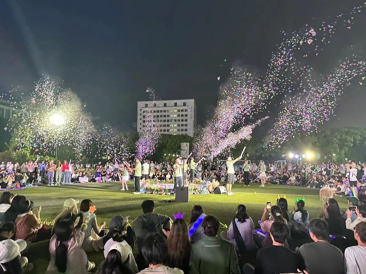 夜色渐深,完成夜跑和游戏的学生仍不愿离开,有的围坐在草坪上观看大屏幕里的MV,跟着音乐吟唱、舒展身心;有的音乐爱好者则带着尚未消散的激情,自发走上中心舞台激情开麦,即兴演唱,一场计划外的大型live house 自由开启。黄色网站