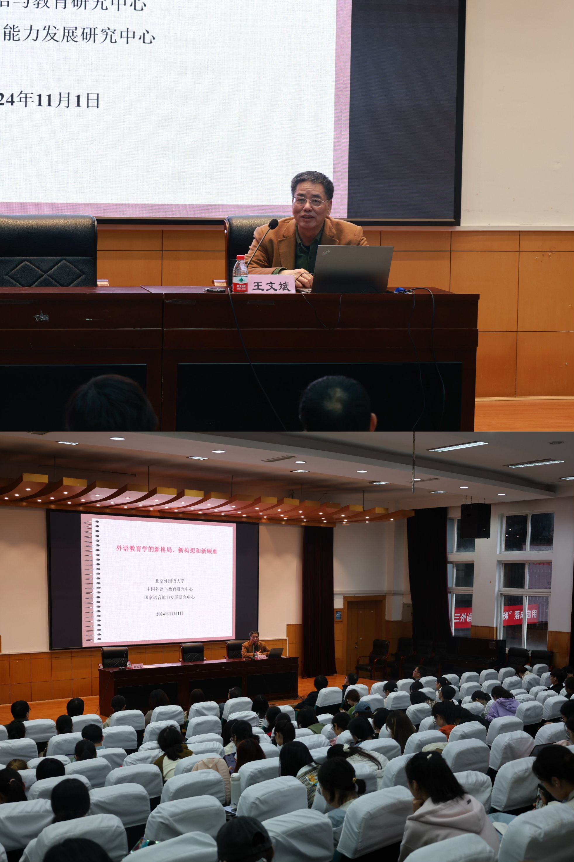 2024年11月1日下午,北京外国语大学教育部人文社科重点研究基地“中国外语与教育研究中心”主任,教育部高等学校英语专业教学指导分委员会副主任委员王文斌教授做客黄色网站 人文社会科学名家讲坛第436讲,在李达三外语楼218学术报告厅为学院师生做专题讲座。此次讲座由学院特聘院长屠国元教授主持。王文斌教授以《外语教育学的新格局、新构想和新顾虑》为题,围绕外语教育当前存在的问题、外语教育的新格局以及外语教育的未来发展构想等方面进行了深入阐述和剖析。讲座伊始,王教授深入阐述了外语教育当前存在的问题和面临的挑战。他认为,随着人工智能在教育领域的广泛应用,为国家培养高质量的外语人才,是外语教育的新使命、新担当;外语教育的新格局应更加聚焦于母语语言修养的提升、更加注重培养隐形文化的理解能力以及弹性的思维能力,更加注重外语教育实践等。他旁征博引,通过详细解读国内知名大学校名的深刻内涵,强调了提升母语语言修养的必要性以及准确理解隐形文化的重要性。为此,王教授建议外语教师和学生应大量阅读文学作品。围绕弹性思维能力的培养,王教授通过“云山”和“家和万事兴”的英文翻译,深入阐释了外语教育过程中如何培养学生的灵活思维能力以及语言表达的创造力。围绕外语教育实践,王教授提倡外语教师应敢于突破固有的教学框架,采用创新的教学方法,并运用恰当的教学语言来实施个性化的教学方案,进而提高外语教育的教学效果和学习效能。关于外语教育未来发展的构想,王教授强调,外语教师应了解掌握人工智能技术,充分利用ChatGPT类大语言模型等数智化带来的便利。屠国元教授在总结讲话中表示,王文斌教授的讲座高屋建瓴,对广大外语教师和学生全面、深刻理解《外语教育学的新格局、新构想和新顾虑》具有全新的指导意义,对外语学科的建设、人才培养制度的创新等方面提供了实践路径。